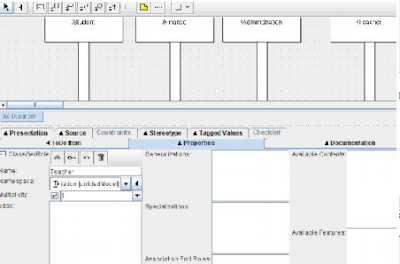 8. Buat kelas Teacher dengan langkah yang sama dengan kelas Student dan lengkapi dengan atribut IDTeacher int, Name String dan tambahkan Operation AddTeacher. Drag icon association dan drag dari kelas Teacher ke kelas Student dan berilah name Teach.